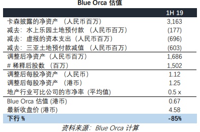 Blue Orca称,如今,卡森唯一实质的业务是地产开发,但这也将随着剩余住宅单元的售罄而岌岌可危。由于其他业务部门都处于亏损中,对卡森最乐观的估值方法是参照其他可比的香港上市地产公司的平均市净率(0.5 倍)。在将该机构认为不存在的项目及资产剔除出卡森的净资产后,其对卡森的估值在 0.67 港元,下行空间 85%,但这也还是保守估计。