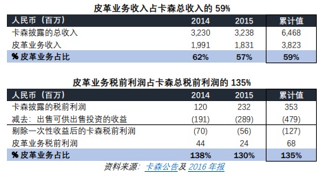 一个需要注意的关键是,在2014-2015年即交易前两年,卡森唯一的盈利来源就是该皮革业务。如果我们剔除出售投资带来的一次性收益,公司的其他业务其实是巨亏的4。为了使出售交易更能被投资者接受,卡森声称皮革业务正面临非常严峻的竞争,致使其收入和盈利状况恶化。为此,卡森声称皮革业务在2016年(出售当年)仅创造了13亿元人民币的收入和1,510万元人民币的净利。