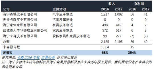 然而,公开可得的工商财务数据显示,被出售皮革业务子公司的收入和净利远高于卡森出售交易中的披露。据卡森披露,皮革业务有七家公司组成,其中只有五家重要的子公司在年报中列示。可供投资者查阅的工商档案显示,这些公司在2016年有22亿元人民币的总收入,比卡森在出售时报告的同期业务收入高出68%。工商档案还显示,被出售业务在2016年产生净利润6,900万元,比卡森报告的出售当年金额高出354%。