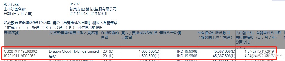智通财经APP获悉,联交所最新资料显示,11月15日,股东唐华透过其控制的公司Dragon Cloud Holdings Limited减持新东方在线(01797)160.35万股,每股作价19.9668港元,总金额约为3201.68万港元。减持后最新持股数目约为4538.76万股,最新持股比例为4.84%。