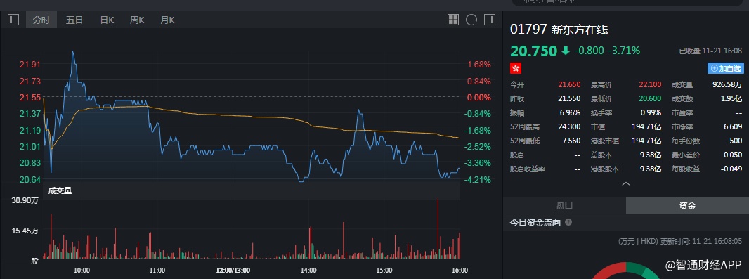 截至今日收盘,新东方在线跌3.71%,报20.75港元。