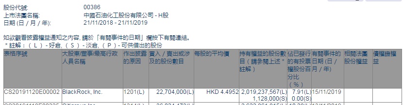 智通财经APP获悉,港交所最新资料显示,11月15日,贝莱德减持中石化(00386)2270.4万股,每股作价4.49港元,总金额约为1.01亿港元。减持后最新持股数目约为20.19亿股,最新持股比例为7.91%。