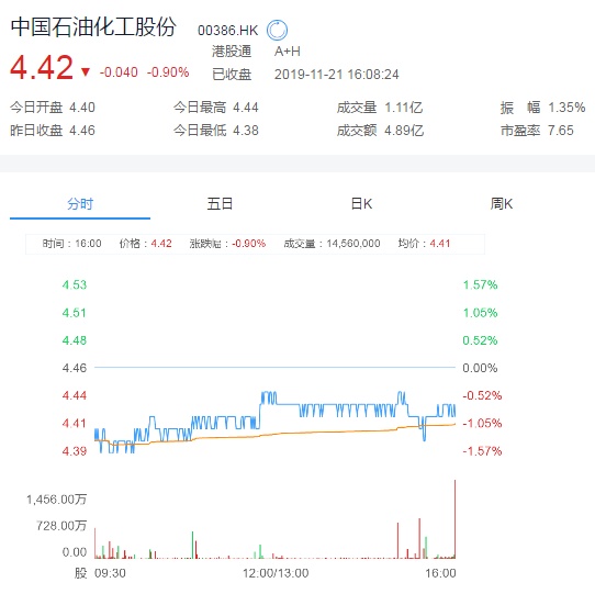 截至今日收盘,中石化跌0.9%,报4.42港元。