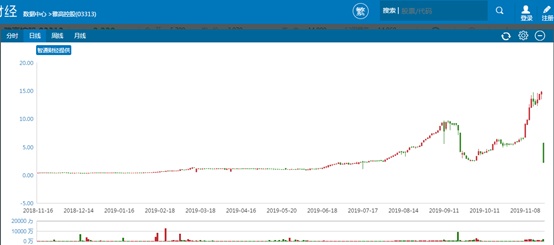 11月8日,雅高当日录得40%的涨幅后公司发布公告称,公司股份获MSCI选为MSCI中国全股票指数的成份股,自2019年11月26日营业时间结束后即会生效,接下来的数日,雅高股价超越了9月份创出的高点,一路走向了458.65亿港元的市值巅峰。自10月8日起至11月20日算,雅高控股累计涨幅高达4.8倍。