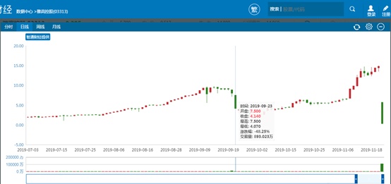 二级市场方面,公司股价也终于在9月11日迎来年初后的首次16.13%大跌,上涨态势随之戛然而止,股价高位维持几天后,伴随着市场质疑声的不断增加,9月20日公司股价再次录得11.11%的跌幅,当天成交资金高达7.47亿港元。公司也于当日晚间发布了股价异常变动的自愿性公告表示,股价异常波动是因为公司被FTSERussell,选为富时全球股票指数系列(中国指数)的成份股,自2019年9月20日营业时间结束后生效。