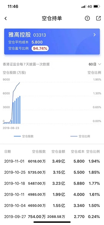 不过,雅高上行的股价不仅没让空方退却,反倒是积聚的能量越来越足了。智通财经APP的空仓持单数据显示,雅高控股10月份以来的空仓金额从9月末的2000万激增至1.55亿,11月1日的时候已经高达3.49亿,空仓成本为5.8港元,空仓比例上升到了1.94%。期间有意思的是,雅高控股持股比例高达18.04%的执行董事梁迦杰,于10月11日宣布辞任了,公司公告中未做其它的说明。