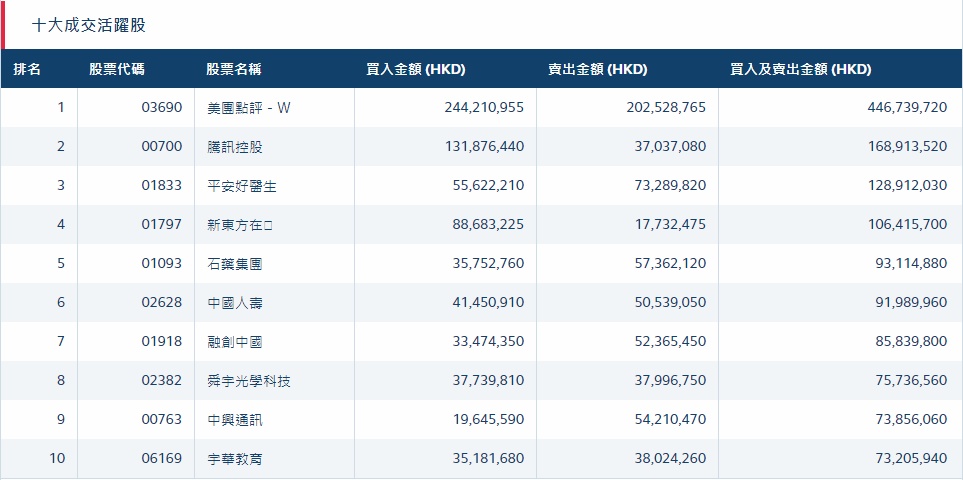 腾讯(00700)、新东方在线(01797)、金山软件(03888)分别获净买入9312万、7095万、1195万港元。此外,中兴通讯(00763)、中国人寿(02628)分别遭净卖出3456万、908万港元。