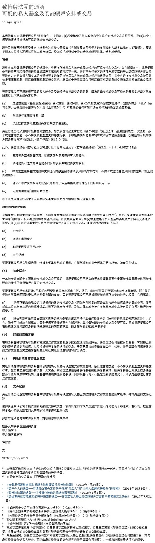 智通财经APP获悉,近日,香港证监会发布通函,要求各资产管理公司对于可疑的安排或者交易要加大审查力度,不能像过去漠视其行为。