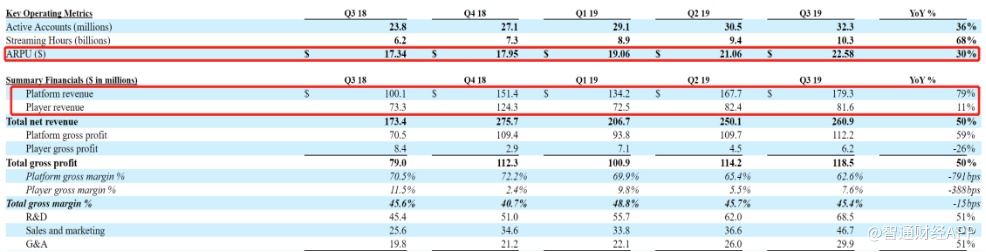 Roku的多项核心运营数据却继续超出市场预期。特别是其平台收入达到1.793亿美元,同比增长79%,占比同比提升11个百分点达69%;直播时间比上一季度增加了9亿小时,达到103亿小时;单个用户平均收入(ARPU)为22.58美元(过去12个月),同比增长30%;活跃帐户为3230万,比上一季度净增加170万;Roku通过视频广告产生的收入再次同比增长了一倍以上。Roku称,Roku TV在今年前9个月在美国销售的智能电视中占了三分之一以上。