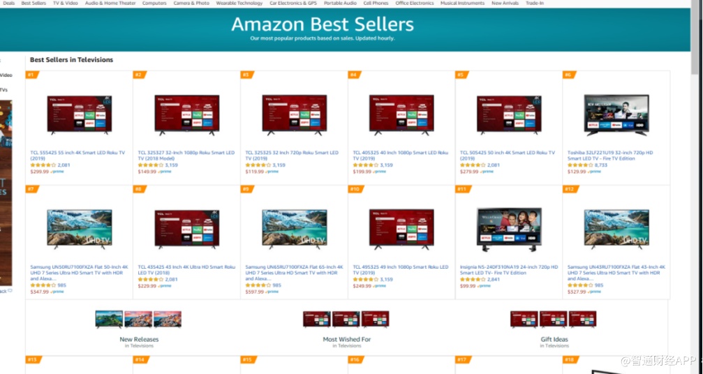 近期,亚马逊销量最佳电视排行榜前10中,有7款是TCL Roku TV,排在第一位的是一款55吋电视机。