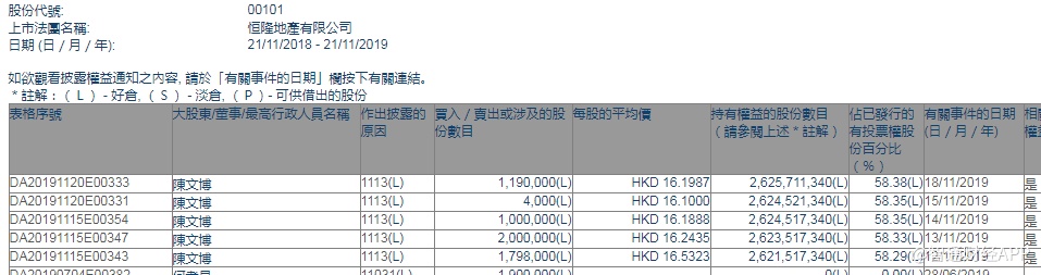 智通财经APP获悉,联交所最新资料显示,11月18日,陈博文增持恒隆地产(00101)119万股,每股作价为16.1987港元,总金额约为1927.65万港元。截止到18日,陈博文本月共增持恒隆地产593.8万股,增持后最新持股数目约为26.26亿股,最新持股比例为58.38%。