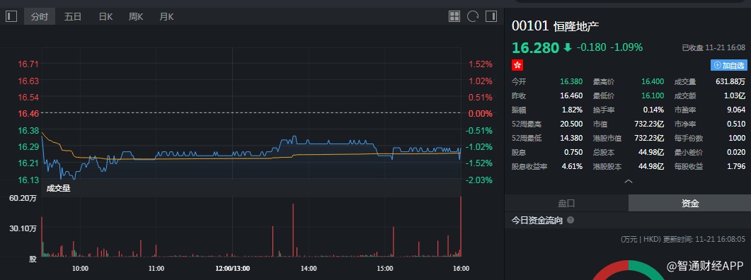 截至今日收盘,恒隆地产跌1.09%,报16.28港元。