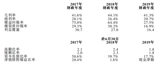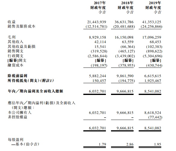 整体毛利率由2017年财政年度的41.6%增加至2018年财政年度的44.1%,此主要由于来自管理服务的收益增加,导致2018年财政年度的利润率高所致,毛利率随后减少至2019年财政年度41.3%。