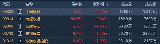 截至发稿,中国建材(03323)涨4.14%,报7.55港元;海螺水泥(00914)涨2.64%,报50.6港元;金隅集团(02009)涨1.42%,报2.14港元;亚洲水泥(中国)(00743)涨1.25%,报9.74港元;华润水泥控股(01313)涨0.65%,报9.26港元。
