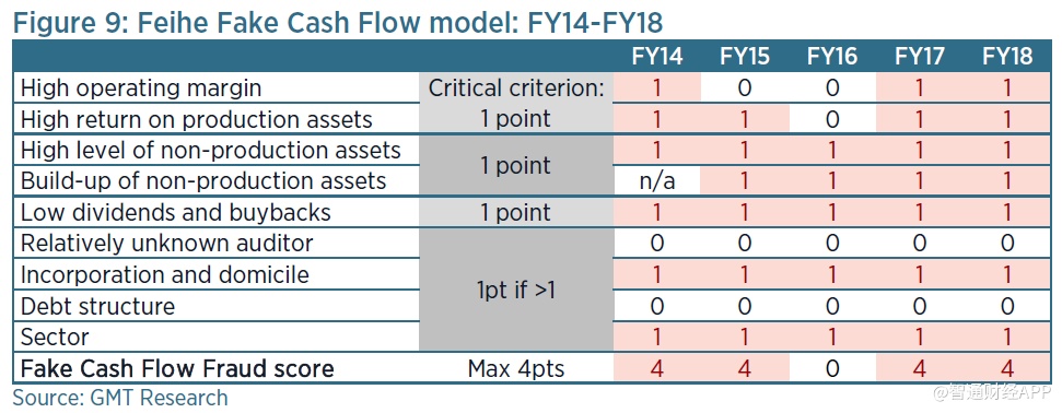 该模型可以用于识别出可能存在虚报部分收入和利润的公司,是在对一大批已被证实的中国伪造现金流欺诈案样本的财务分析基础上发展而来的。飞鹤的高利润率存在异常(得1分),其2018财年的营业利润率(不包括政府补贴)为26%,生产资产回报率(定义为固定资产加上库存)为165%,相对于同行业的其他公司而言均处于前五分之一水平。我们发现,现金流造假欺诈行为几乎总是异常有利可图。而2012财年,该公司当时的利润率仅为平均水平(得0分)。