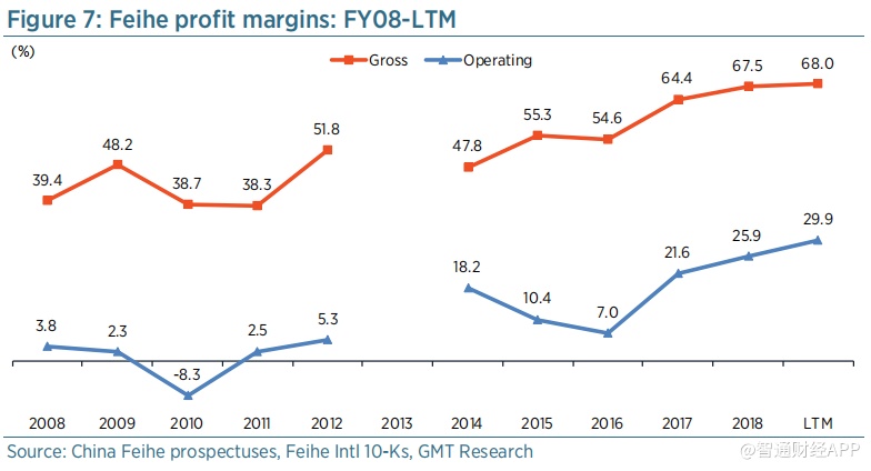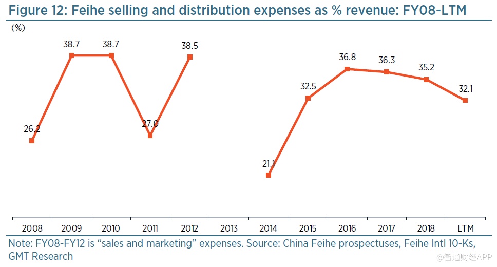 从图12可以看出,在2014至2018财年期间,飞鹤的销售和分销费用大幅增加,2018财年占营收的35%。公司表示,费用增加的原因是更高的广告和促销费用。2019财年上半年销售和分销费用有所下降,这主要是由于广告支出的减少。它们在这种水平上是否可持续,仍有待观察。