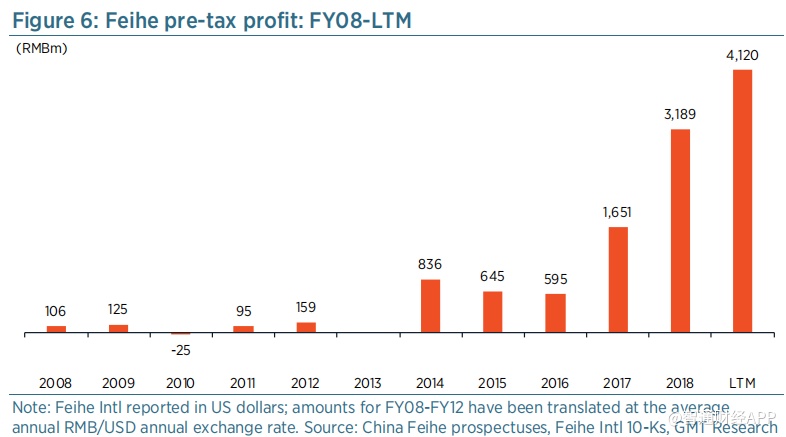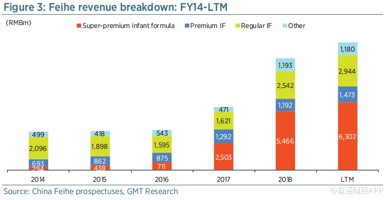 当在美国上市时,飞鹤仅是一家并不起眼的婴幼儿配方奶粉生厂商,有着平庸的增长速度和利润。2013年被私有化后,飞鹤就从公众视野中消失了,直到最近来到香港上市。然而在短短几年内,飞鹤摇身一变,成为了高端奶粉的领导者,其市场份额高达25%,并且拥有极为出色的营收增速和高利润。2016至2018财年,其收入增长了两倍,税前利润增长了五倍多——这几乎完全归功于其超高端产品星飞帆(AstroBaby)的销售增长,该产品在短短两年内增长了七倍。