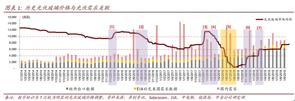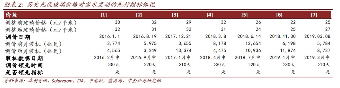 我们认为从历史上7次较为明显的光伏玻璃价格调整来看(如图表一),光伏玻璃价格对下游需求表现有领先指标的作用: