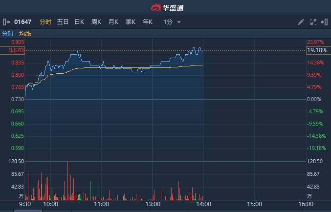 智通财经APP获悉,雄岸科技(01647)受益于区块链概念,近期股价持续攀升,今日盘中涨超20%刷新近半年新高,本月累计涨超一倍。截至发稿, 涨19.18%,报0.87港元,成交额2166.8万港元。