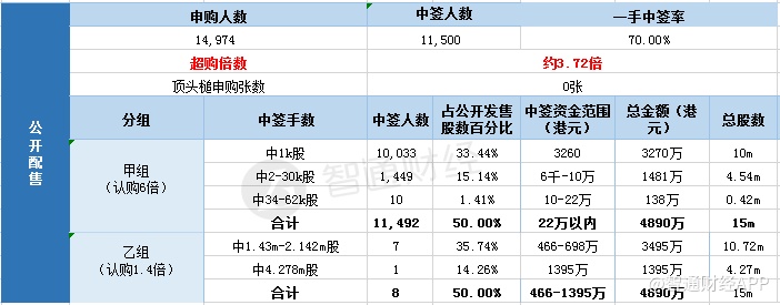 其中,公开配售申购人数14974,一手中签率70%,超购倍数约3.72倍。