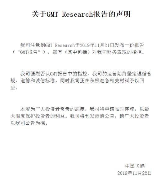 智通财经APP获悉,据新京报报道,11月22日,中国飞鹤(06186)董事长冷友斌针对GMT Research机构做空一事发表内部信称,GMT Research对飞鹤的指控毫无根据、恶意中伤,不仅严重误导投资者,伤害了飞鹤品牌,更伤害了中国乳业,对此坚决不能容忍,公司将保留付诸法律的权利。今日中国飞鹤正式发布声明,并申请临时停牌,以下是原声明。