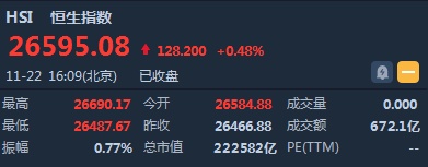 智通财经APP获悉,恒指早盘高开118点或0.45%,报26584.88点。截至收盘,恒生指数涨128.2点或0.48%,报26595.08点,全日成交额达672.12亿。国企指数涨0.54%,报10506.17点,红筹指数涨0.62%,报4263.74点。