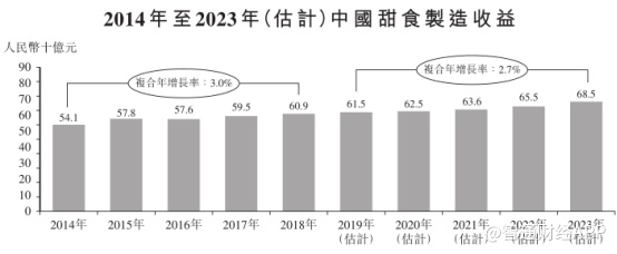 与此同时,尽管人均甜食消费量有所下降,甜食单位价格上涨有所抵消,整体市场规模仍处于增长状态。自2014年至2018年,,甜食制造市场的市场规模复合年增长率为3.0%,预期于2019年至2023年间将以约2.7%的复合年增长率增长。
