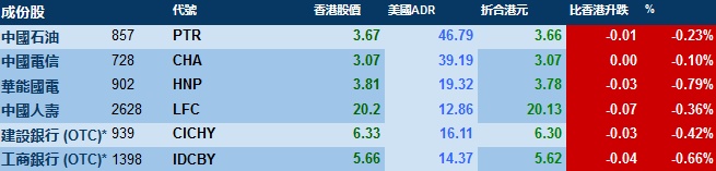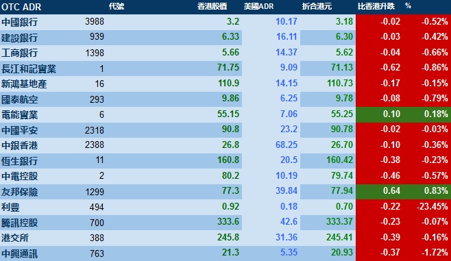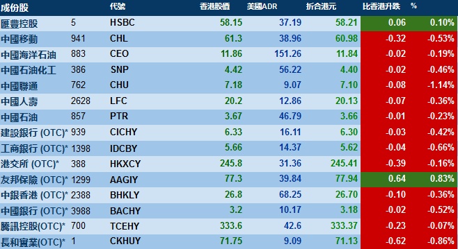 智通财经APP获悉,美股三大指数小幅上涨,港股ADR指数微跌,按比例计算,收报26574点,跌21.35点或0.08%。大型蓝筹普跌,汇丰控股收报58.21元,较港收市升0.06元;腾讯控股收报333.37元,较港收市跌0.23元。