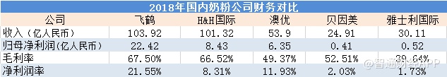 招股书显示,飞鹤是国内最大的婴幼儿配方奶粉集团,市场份额为15.6%,近几年业绩迅猛增长。2012年,飞鹤的收入规模仅约为18.35亿元人民币(单位下同),纯利为1.45亿元,到2018年收入达到103.92亿元,纯利22.42亿元。也就是说,在短短六年时间内,飞鹤收入增长接近5倍,纯利增长超过14倍,远远高于两大乳业巨头伊利和蒙牛同期的增长,与澳优(01717)、贝因美、雅士利国际(01230)等奶粉品牌相比,更是遥遥领先。