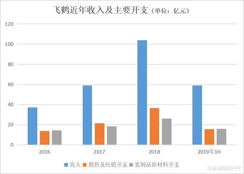 快速扩张的渠道和强大的营销力度支撑了飞鹤奶粉销量大幅增加,相应地,也带来了高额的经销开支。数据显示,2017及2018年飞鹤的销售及经销开支分别同比增长68.5%、71.16%,占总收入的36%、35%,甚至超过乳制品原材料支出占比。