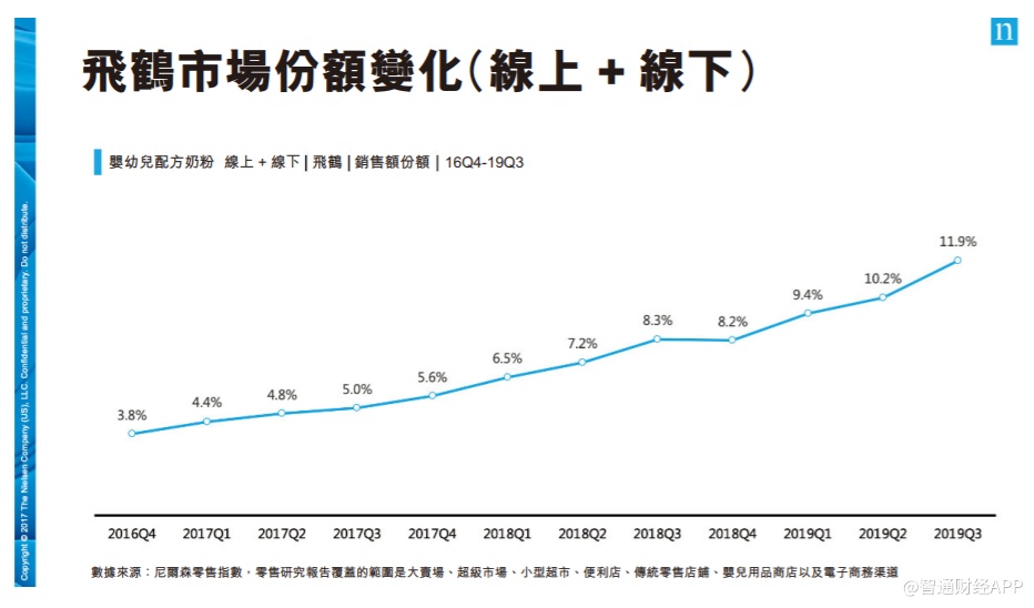 在澄清公告中,飞鹤给出了2016年四季度以来公司市场份额稳步升高的数据图表,数据来源为尼尔森零售指数。