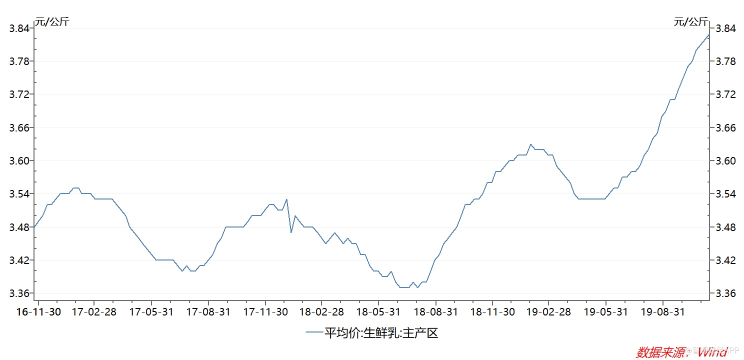 值得注意的是,飞鹤大部分的鲜奶采购自原生态集团,2016-2018年,向原生态集团采购鲜奶的价格呈略微下降的趋势,但2019年上半年鲜奶采购价明显上升,为4121.2元/吨,超过2016年的价格,这可能与国内鲜奶价格上涨有关,但另一方面,从上升幅度超过行业平均的角度看,是否意味着飞鹤对上游的议价能力在减弱呢?如果这样,飞鹤将面临毛利率承压的局面,因为今年下半年来,生鲜乳价格仍在继续上涨,而飞鹤产品提价能力已逐渐达到天花板。