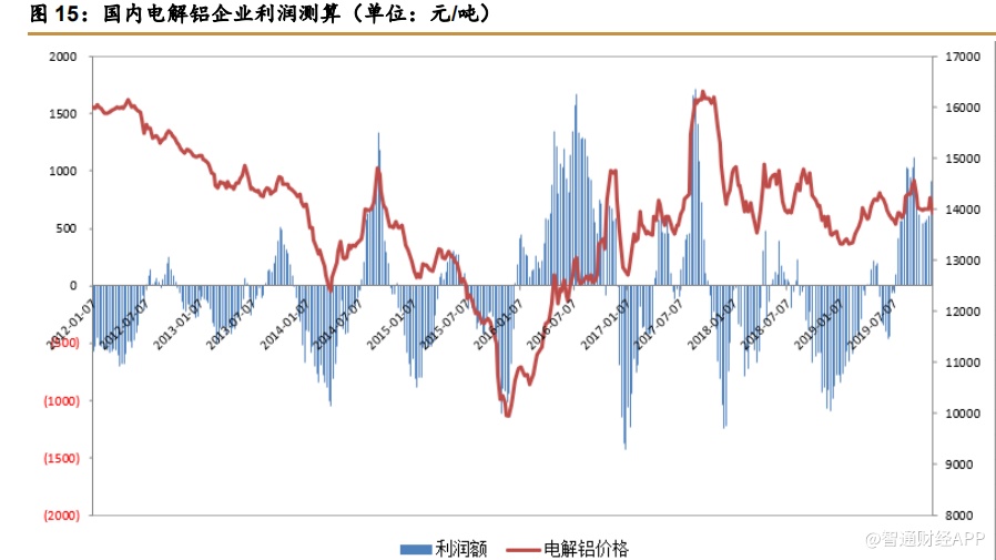 综上所述,随着氧化铝价格的快速回落,整个铝产业链的利润转移到电解铝环节,预计目前国内电解铝单吨利润额能达到 650 元/吨(未考虑所得税)。考虑到氧化铝供应过剩的格局将延续,电解铝企业将持续获得利润,相比去年持续大幅亏损的情况明显改善,同比将扭亏为盈。