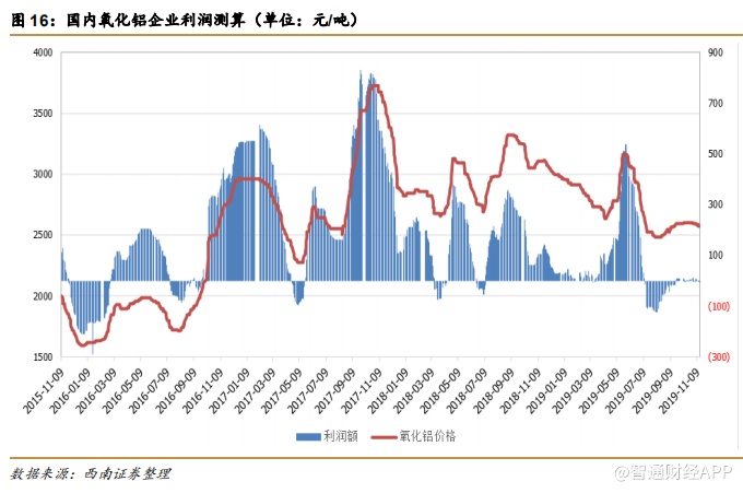 年初至今,电解铝的价格走势是略超市场预期的。前期虽然采暖季限产力度不够,但是在电解铝企业持续大范围亏损的情况下,企业减产增加,利润开始修复,到了消费旺季企业甚至有阶段性的利润。之后氧化铝的价格冲高回落,目前已经跌落至底部区间,电解铝企业再次获得相对可观的利润。