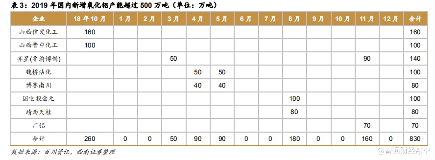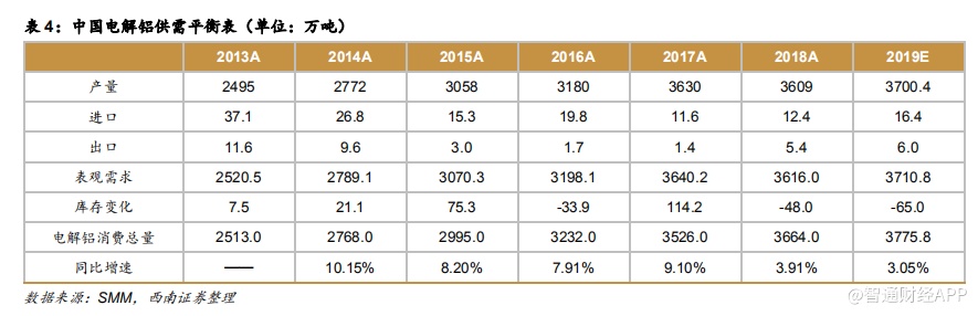 减产产能方面,上海有色数据显示,2018 年年初至今国内电解铝产能共减产大约 400万吨,由于上半年利润不佳,国内减产产能整体复产缓慢。假设剩余两个季度共有 200 万吨电解铝产能复产,叠加新建产能的陆续投产,预计 2019 年国内电解铝总产量约 3700 万吨,同比增长 2.53%,增加约 90 万吨。