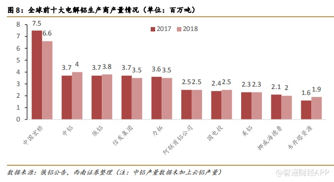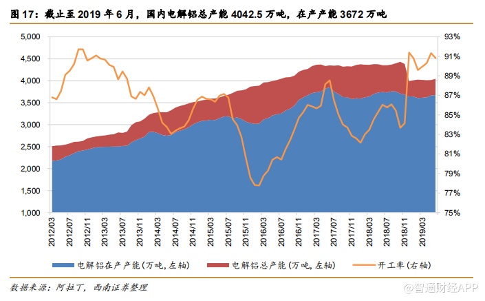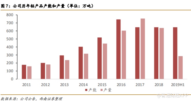 公司现有铝产能为 646 万吨,2018 年全球铝产量居首位。2017 年下半年,因政府推进铝行业供给侧改革,公司关停 268 万吨铝产能,并且受国家铝产能指标限制,公司近两年无新增产能。公司 2018 年全年铝产品产量为 636.5 万吨,产能利用率达到 98.5%。2019 年H1 公司铝产品产量达到 286 万吨,同比减少 10.3%,主要是由于公司 2019 年上半年受政府供暖季限产政策以及期内使用更先进的生产设施置换原有设施,该新生产设施需要等待一定的时间在完成政府有关部门批准后方可投产,导致报告期内产量减少。此外,2019 年 8月的台风“利奇马”导致公司铝产量减少约 20-30 万吨。