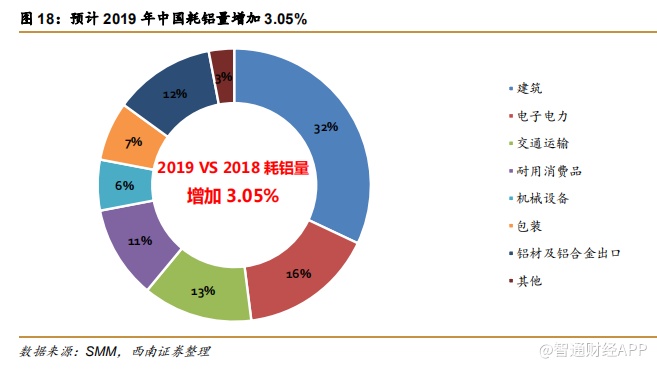 交运用铝占比 13%,折算过来 480 万吨,其中传统乘用车用铝 350 万吨,新能源汽车用铝约 30 万吨,摩托车用铝约 60 万吨。年初至今中国汽车销量数据显著走低,主要是由于多地提前实施乘用车国六排放标准的政策性扰动。政策影响短期内有一定冲击,国五升国六造成的持币待购现象将导致部分需求被延至今年 10 月份,国内汽车销量降幅逐步收窄。从全年的维度测算,预计 2019 年中国乘用车销量增速为-5%,新能源汽车增速为 40%。耐用消费品和包装用铝合计占比 18%,折算过来约 660 万吨。消费领域用铝范围广泛,主要跟踪指标是社会消费品零售总额。当前的社零增速处于下行通道,7 月份数据显示累计同比仅有 8.3%的增速,保守估计全年增速能保持在 6%以上。