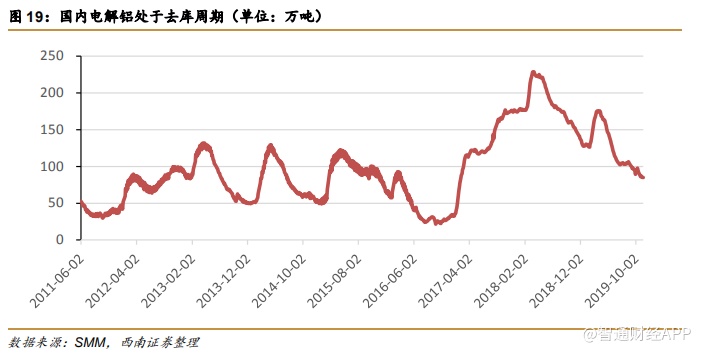电解铝处于去库周期。SMM 最新数据(2019 年 11 月 18 日)显示,国内电解铝实际库存合计约 82.3 万吨,相比年初库存减少 47.9 万吨,而相比春节之后的高点减少 93.2 万吨。预计国内电解铝供需格局边际改善,总产量约 3700 万吨,另外下半年需求会显著好于上半年,总需求量约 3776 万吨,国内电解铝的库存会继续消耗,年末有望回到 70 万吨的水平。