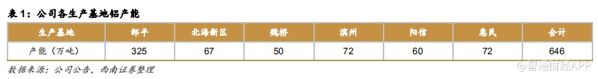 公司目前在山东省滨州市总共拥有 6 处电解铝生产基地,分别位于邹平、北海新区、魏桥、滨州、阳信和惠民。公司的电解铝主要采用的是铝水就近销售模式,运输半径不超过 30公里。与铝锭销售相比,铝水销售不仅能节约运输成本,还能为下游客户节约重熔成本,平均每吨铝能降低成本 500 元,公司和下游客户从中共同获益。