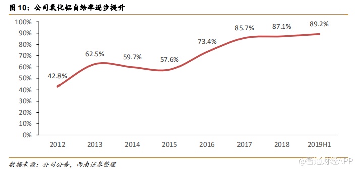 公司氧化铝基本实现自给。公司自 2012 年第一条氧化铝生产线投产以后,氧化铝自给率不断提升,2019 年上半年公司氧化铝自给率为 89.2%。公司目前拥有氧化铝产能 1400 万吨,其中 1300 万吨位于国内,100 万吨是公司在印度尼西亚投资的合资氧化铝厂。外购部分的氧化铝公司主要通过长期大批量采购协议对外采购,因此能够获得低于市场均价的采购价格。根据我们推算,公司 2018 年氧化铝产量约为 1446 万吨,公司现有的 1400 万吨氧化铝产能基本实现满产。