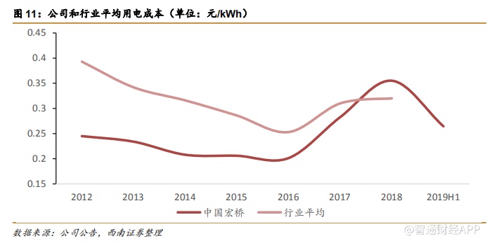 煤价回落,公司电力平均成本下降。公司目前自有电站的装机容量达到 12415 兆瓦,2018 年公司全年用电 920.31 亿千瓦时,其中 720.66 亿千瓦时来自自备电厂,电力自给率达到 78.3%。自备电厂供电为公司长期提供了电力成本优势。由于煤价处于高位,公司 2018年全年用电成本为 0.355 元/kWh,高于行业平均水平。2019 年煤价回落,公司 2019 年上半年用电成本为 0.264 元/kWh,较去年大幅下降。