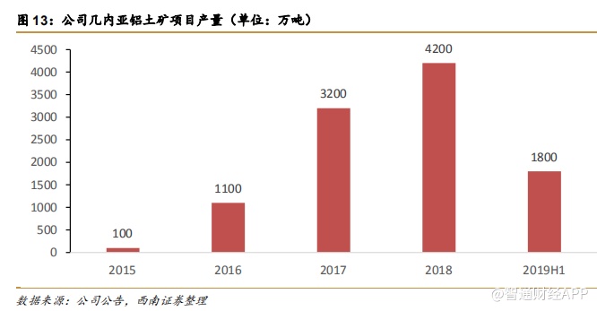 公司通过海外基地进一步保障原料供给。公司在海外的几内亚铝土矿项目于 2015 年投产,并且产量逐年提升,2018 年铝土矿产量为 4200 万吨,有利于公司巩固长期稳定和高性价比的铝土矿资源。2018 年 12 月,在之前几内亚铝土矿项目取得显著成效之后,公司与其他业务伙伴共同和几内亚政府签署了开矿、铁路和氧化铝厂的三大公约,计划修建一个铝土矿开发项目,一条 135 公里长的铁路以及一个氧化铝厂。该等项目的顺利实施有助于长远确保公司原材料供应的稳定性。