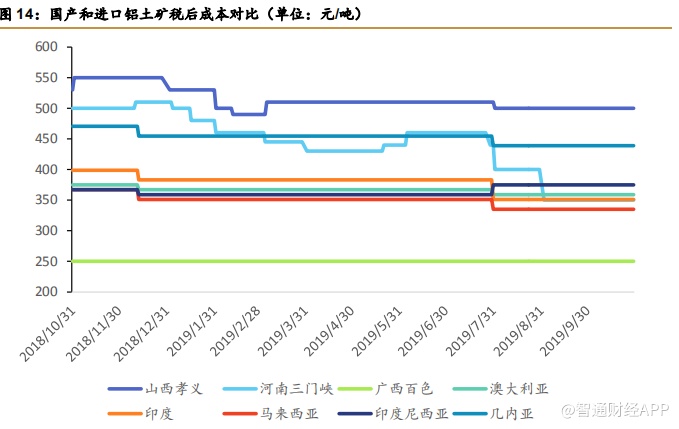 公司积极采取多渠道战略拓展铝土矿供应。公司外购铝土矿主要来自进口矿,来源包括澳大利亚、印度和马来西亚等国,扩展供应渠道有助于稳定原料供应。公司国内的氧化铝厂位于山东,具有港口优势,来自澳大利亚、印度、马来西亚和印尼的进口矿相比山西和河南的国产铝土矿,长期具有成本优势。