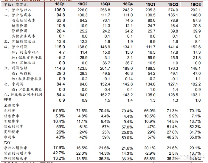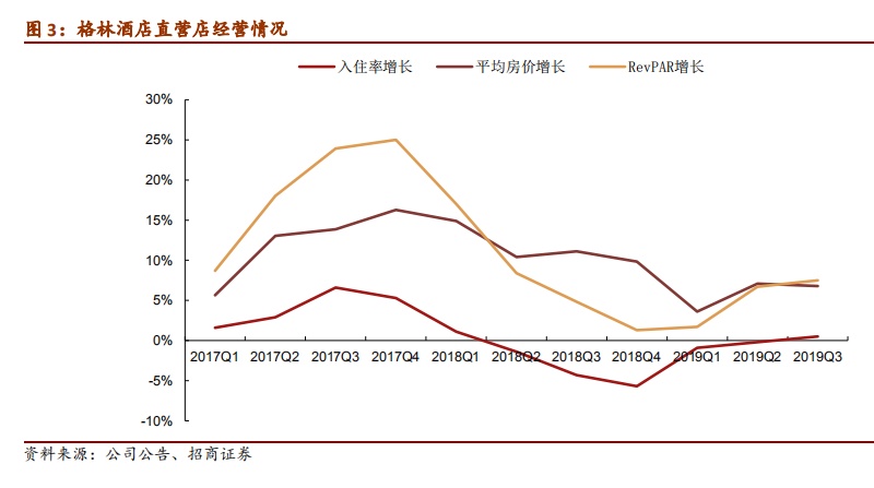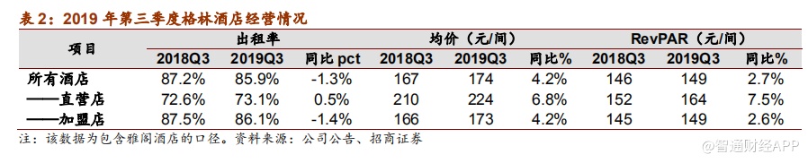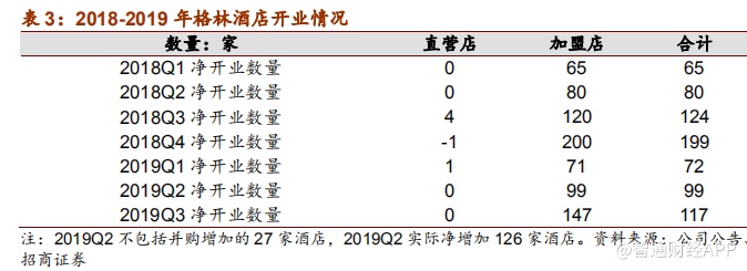 Q3净开业147家,较上年同期提速。19Q3格林酒店开业181家,关店34家,净开业147家。开业中经济型66家,中档92家,中高档20家,高档奢侈3家;从地域上看,开业酒店中16家位于一线城市,127家位于二线城市,38家分布于其他城市。截止2019年第三季度,公司已开业酒店3102家,包括30家直营和3072家加盟,待开业酒店652家。