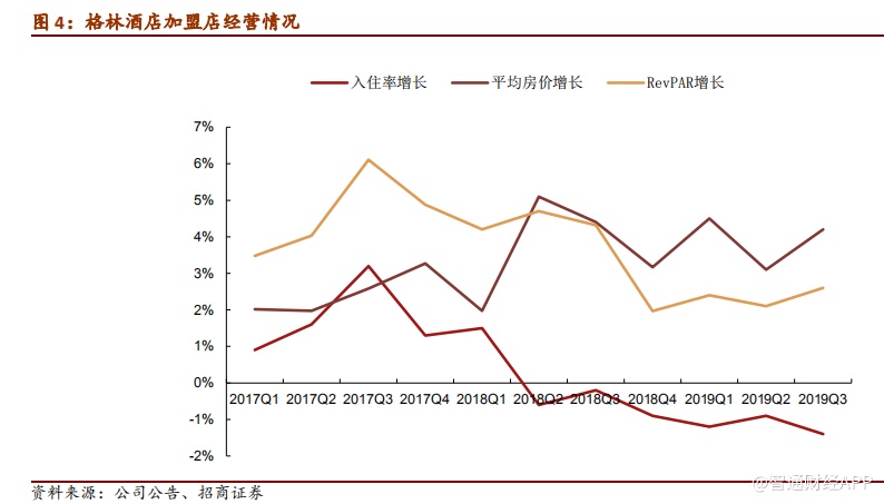 格林Q3业绩稳定增长,新开加盟店贡献增量。Q3格林酒店收入增长20.1%,主要是:1)公司Q3加盟店净开业117家,酒店总数较上年同期提升19.9%;2)RevPAR内生增长1.9%;3)公司收购雅阁酒店。归属净利润下降28.4%,主要是2019Q3产生大量股权投资亏损,调整后归属净利润增长17%,增速与Q2(+17%)相当。