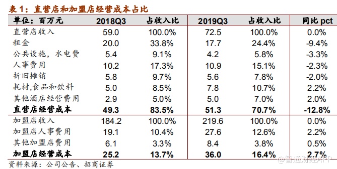加盟店毛利率下降,期间费用同比上涨。公司Q3直营店毛利率29.3%/上涨12.8pct,主要是开业直营店运营成熟,租金、公用设施、人事费用等成本占比下降;加盟店毛利率83.6%/下降2.7pct,主要是雅阁酒店并表,以及加盟店扩张带来的人事费用上涨。期间费用方面,销售费用率为7.1%/上升2.7pct,主要是新增两个品牌的广告费用;管理费用率为13.7%/上升4.3pct,主要是并购雅阁酒店,以及增加了基于股份的补偿费用、IT研发和总部员工费用。