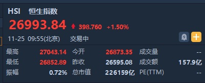 智通财经APP获悉,早盘蓝筹股全线走强,带动恒指涨超400点,盘中一度高见27043.13点。