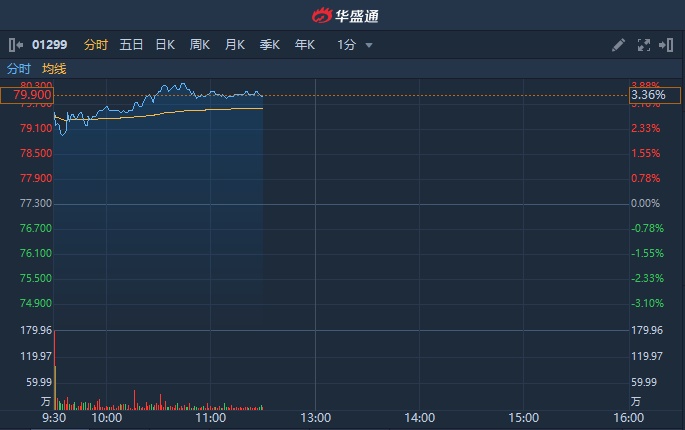 智通财经APP获悉,李源祥将出任友邦(01299)首席执行官兼总裁,瑞信发表报告指有关任命对友邦正面,相信可提升友邦于科技上的表现。该行维持友邦”跑赢大市“评级,目标价91元。截至发稿,友邦涨3.36%,报79.95港元,成交额10.85亿港元。