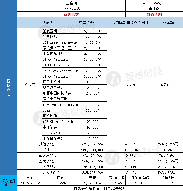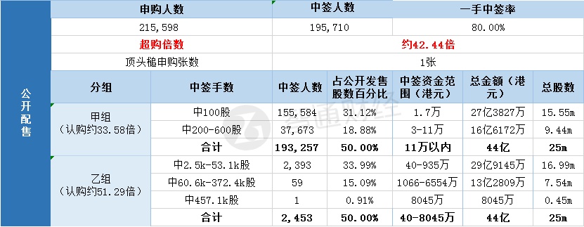 其中,公开配售申购人数215598,一手中签率80%,超购倍数约42.44倍。