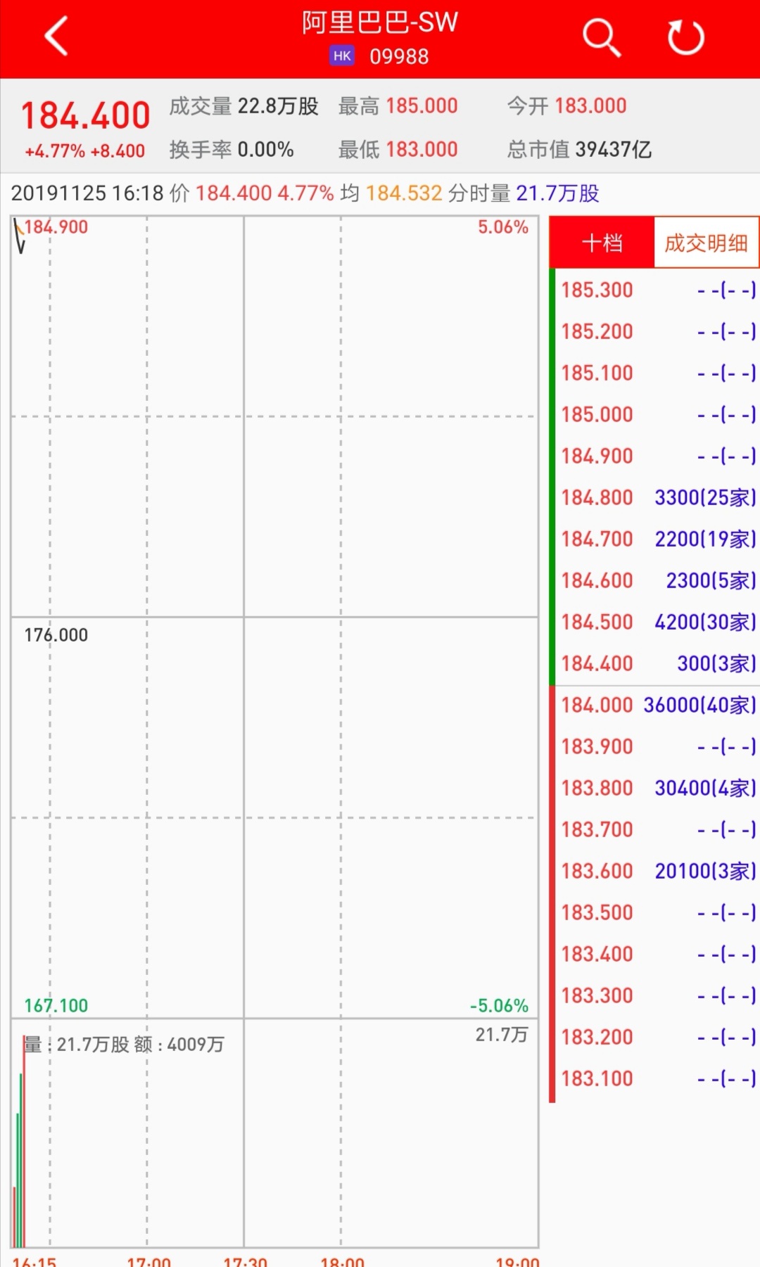 智通财经APP获悉,阿里巴巴-SW(09988)将于11月26日挂牌,今日(11月25日)暗盘开盘涨逾4%,截止到发稿,辉立证券暗盘交易显示其报价184.1港元,较招股价176港元涨4.602%。每手100股,不计手续费,每手赚810港元。